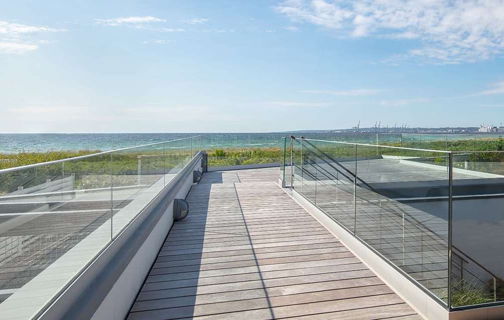 Sistema per parapetti in vetro Q-railing EASY GLASS® UP TOP costituito da profilo di alluminio a sezione ridotta, spazzolato e anodizzato (25 micron), adatto per montaggio superiore sopra muretto preesistente, completo di vetro stratificato dello spessore di 17,52 mm (H max. 80 mm) regolato e fissato rapidamente con il sistema SAFETY WEDGE SYSTEM.