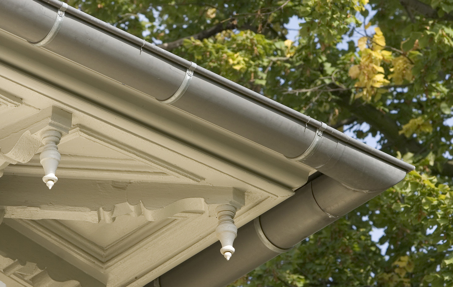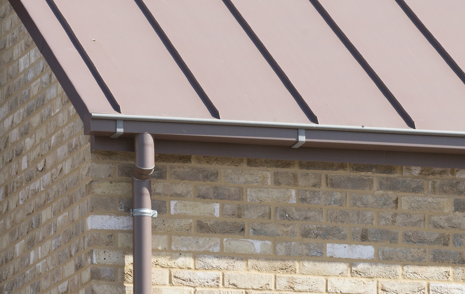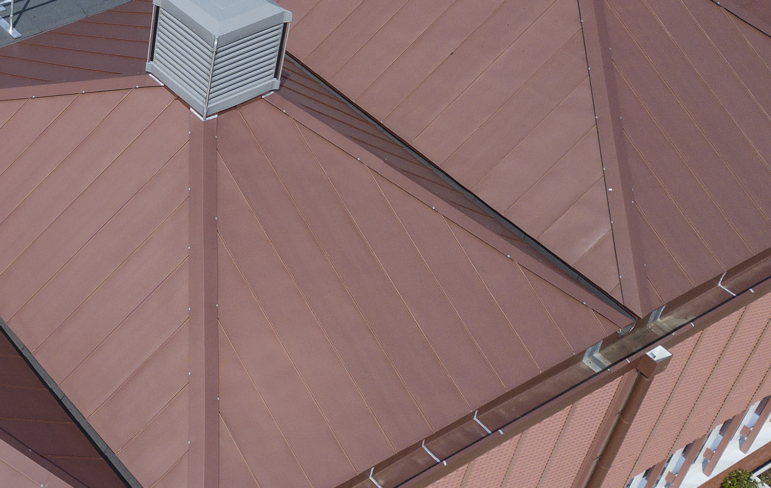 Copertura ventilata a doppia aggraffatura VMZINC® PIGMENTO® COP in laminato in lega di zinco-titanio prepatinato grigio chiaro con sfumatura di color rosso, marrone, verde o blu, con marchiatura continua nel rispetto della norma EN 988, adatta per falde con pendenza minima del 10% a completa tenuta all’acqua.
