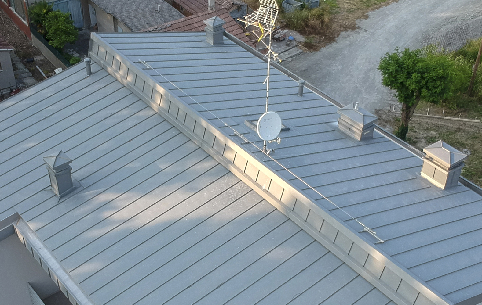 Raccordi camini di copertura a doppia aggraffatura VMZINC® QUARTZ/ANTHRA/PIGMENTO/AZENGAR 3R - ZINC® RC con risvolti verticali in laminato in lega di zinco-titanio (finitura a scelta), con marchiatura continua nel rispetto della norma EN 988, con sviluppo medio pari a 500 mm, adatto per falde con pendenza minima del 10% a completa tenuta all’acqua.