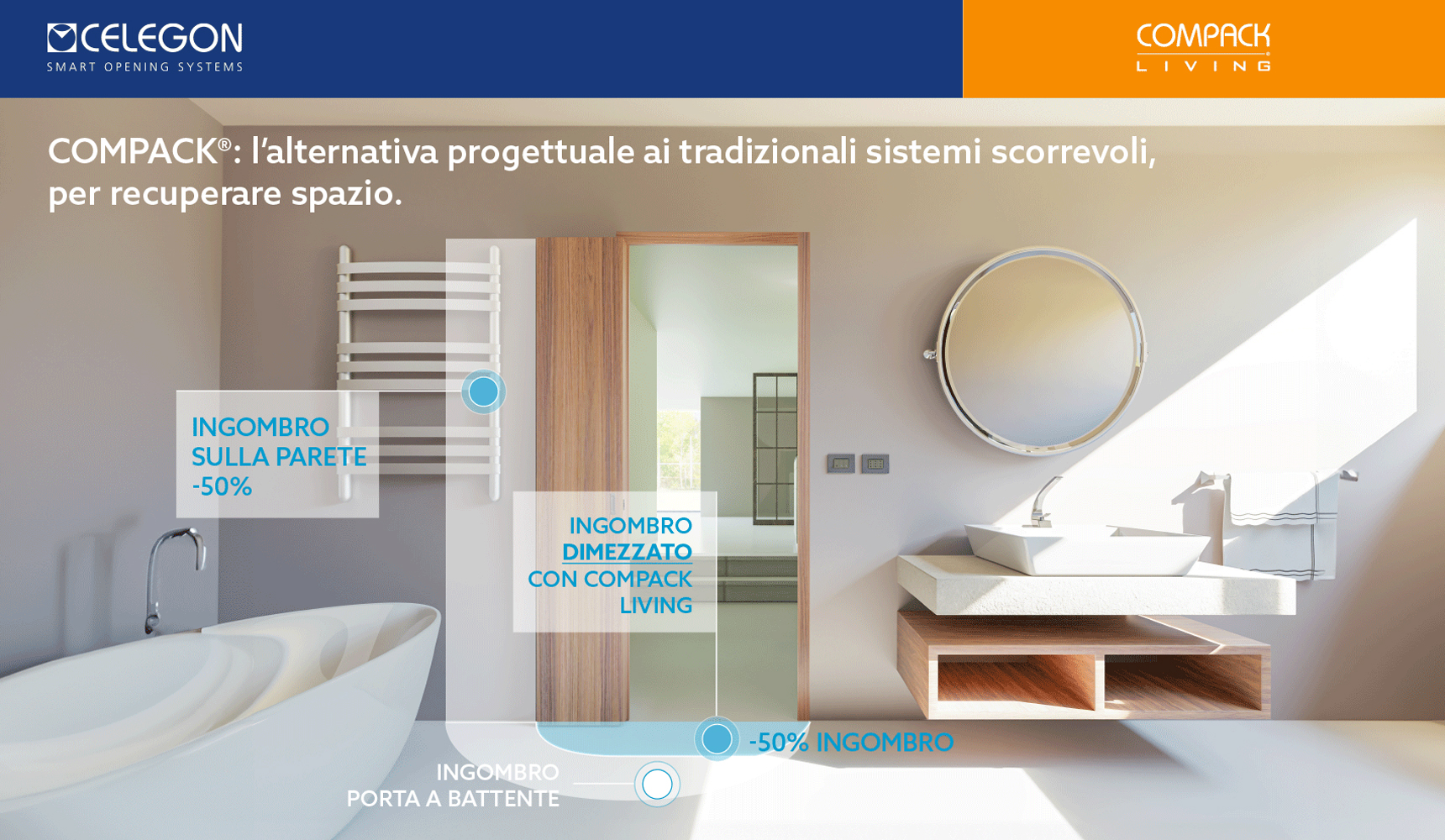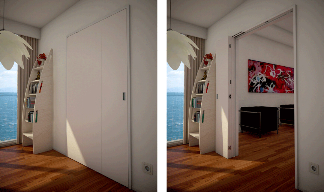Il sistema brevettato di Celegon dimezza l’ingombro di apertura della porta trasformando un limite in un’opportunità progettuale.