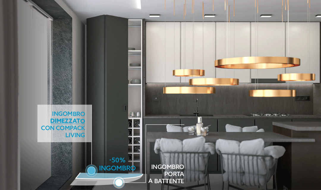 È qui che entra in gioco Compack®, il sistema per porte interne con apertura a libro senza binario sviluppato da Celegon, pensato per trasformare un limite in un’opportunità progettuale, senza interventi murari dedicati.