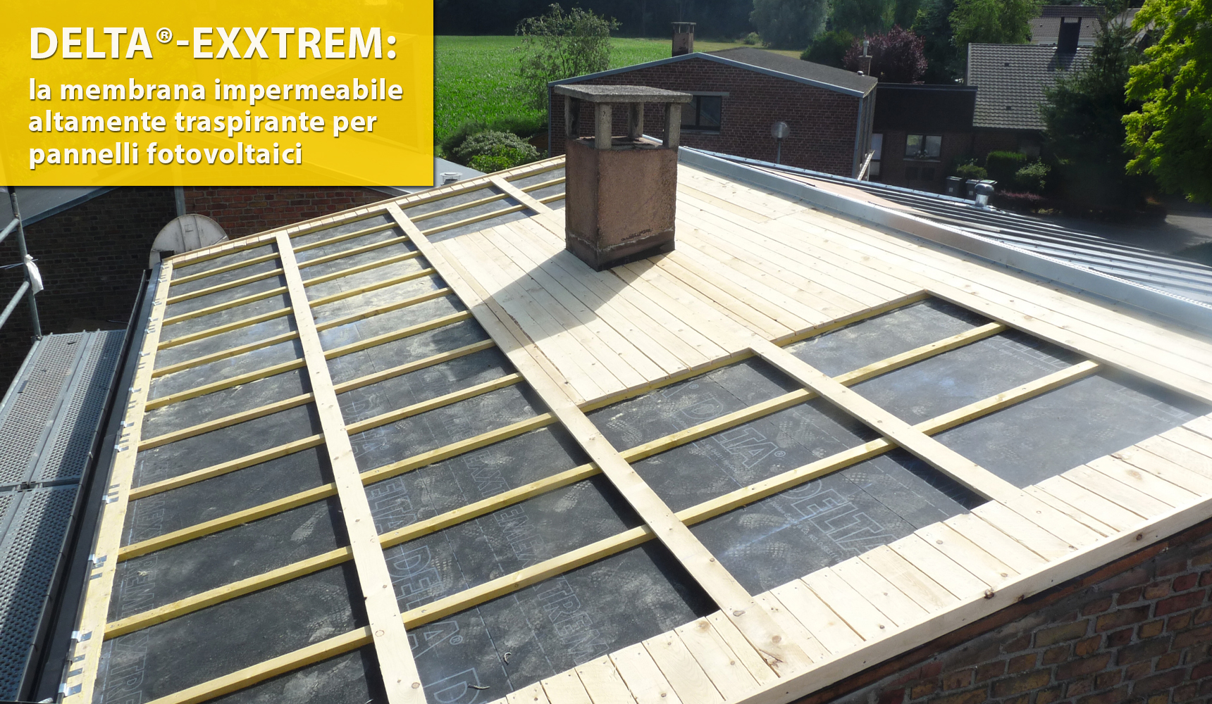 DELTA®-EXXTREM è una membrana impermeabile altamente traspirante ideale per tetti inclinati con manti di copertura in tegole, coppi, scandole e in metallo anche dotati di pannelli solari fotovoltaici e termici e conforme alla direttive previste dalla UNI 11470 relative all’applicazione di schermi e membrane traspiranti e il loro utilizzo su coperture a falda. E' stato progettato appositamente nei casi di elevato irraggiamento solare sulla copertura ed applicato sopra un supporto rigido per l’immediata evacuazione del vapore acqueo con effetto anti-condensa, la tenuta ermetica al vento e la protezione impermeabile sotto i manti di coperture inclinate anche a bassa pendenza <30%.