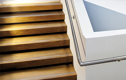 Sistema per parapetti in vetro ad alta prestazione Q-railing EASY GLASS® PRIME TOP, adatto per ambienti ad alto affollamento, costituito da profilo di alluminio spazzolato e anodizzato (25 micron) per montaggio superiore, completo di vetro stratificato dello spessore di 25,52 mm riallineato, regolato e fissato rapidamente con il sistema innovativo Q-DISC®.