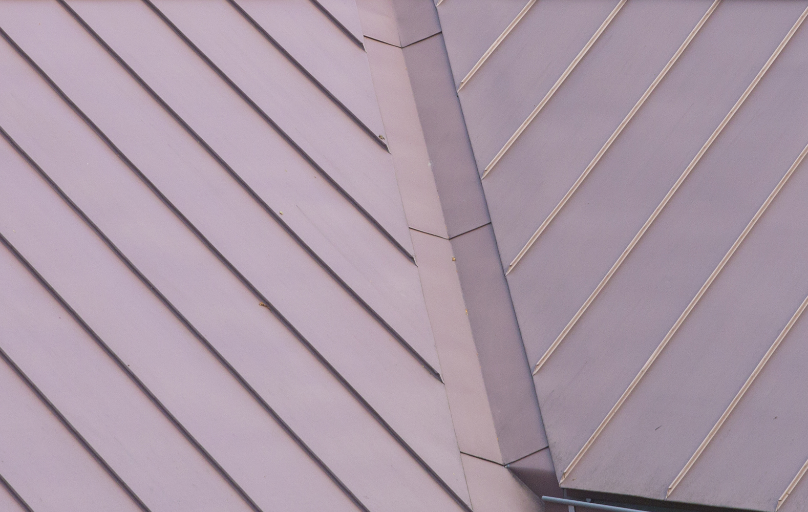 Copertura ventilata a doppia aggraffatura VMZINC® PIGMENTO® COP in laminato in lega di zinco-titanio prepatinato grigio chiaro con sfumatura di color rosso, marrone, verde o blu, con marchiatura continua nel rispetto della norma EN 988, adatta per falde con pendenza minima del 10% a completa tenuta all’acqua.