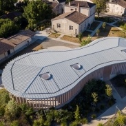Copertura ventilata a doppia aggraffatura VMZINC® AZENGAR 3R ZINC® COP in laminato in lega di zinco-titanio, esteticamente grezzo e rugoso dalle sfumature di grigio chiaro, con marchiatura continua nel rispetto della norma EN 988, adatta per falde con pendenza minima del 10% a completa tenuta all’acqua.