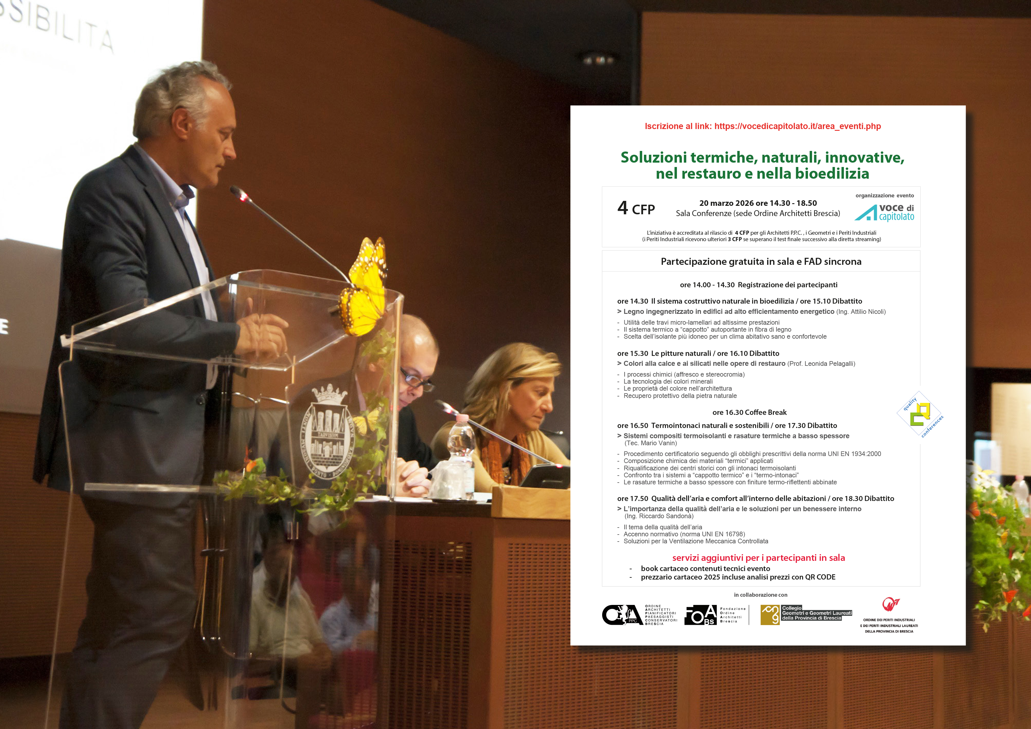 Il seminario gratuito e accreditato dagli Ordini Professionali di Brescia (Architetti, Geometri, Periti Industriali) con 4 CFP, si svolge in modalità frontale (presenza fisica in sala) e in e-learning (FAD sincrona); ai Periti Industriali che superano il test finale dopo la partecipazione in FAD sincrona, sono riconosciuti ulteriori 3 CFP aggiuntivi. A tutti i partecipanti in sala verranno consegnati gratuitamente 2 book cartacei (brochure illustrativa dell'evento, PREZZARIO 2025 contenente le analisi prezzi di numerose lavorazioni).
